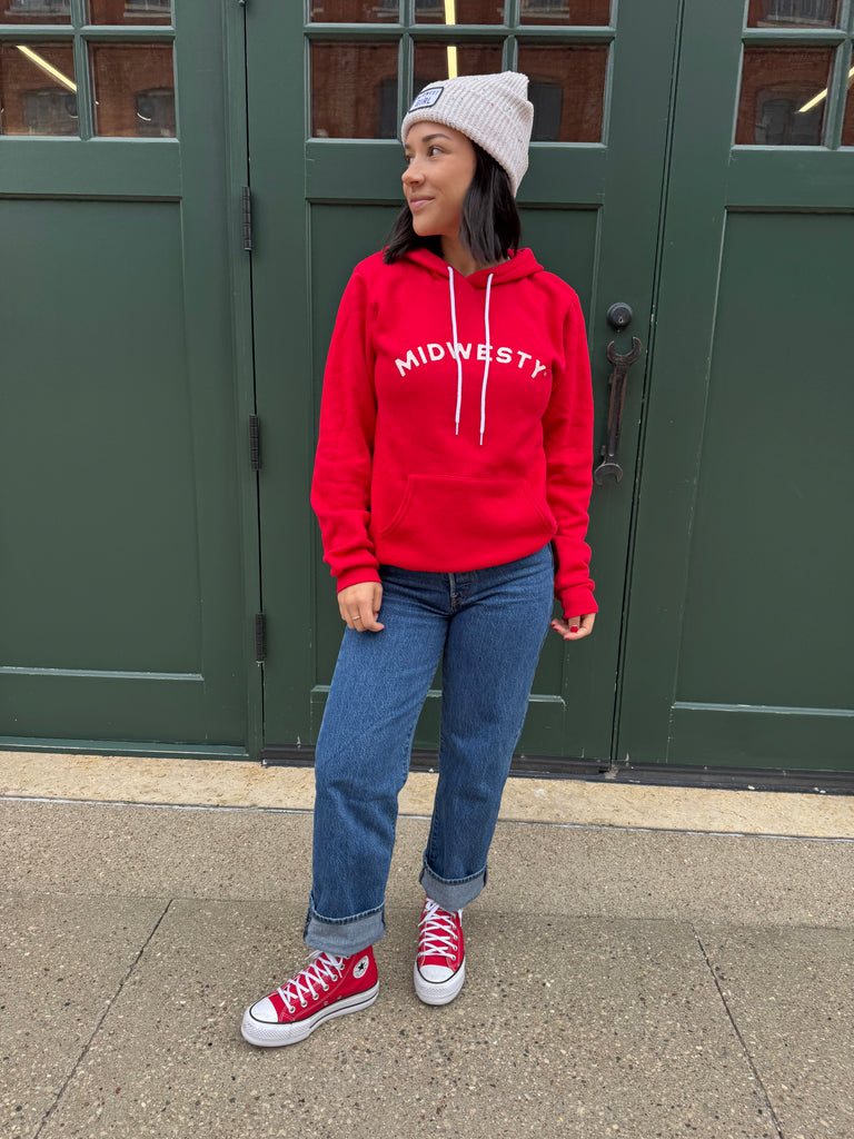 Midwesty Hoodie in Red... Midwesty is the word we use to describe our favorite places, things & people. It’s the cabin you spent a week at as a kid. The one that had the buck hanging on the wall, scratchy plaid sofa & lake that taught you how to swim. It’s the embrace of our changing seasons. But most importantly, Midwesty is you. Down to earth, lover of family tradition, & person who always remembers their roots.