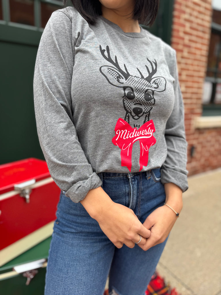 Midwesty® Buck Long Sleeve..a part of our holiday tradition! Our mom always decorated the buck in the family living room growing up. This tee is a nod to those family memories!