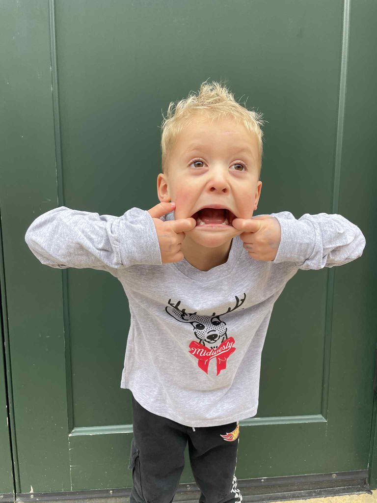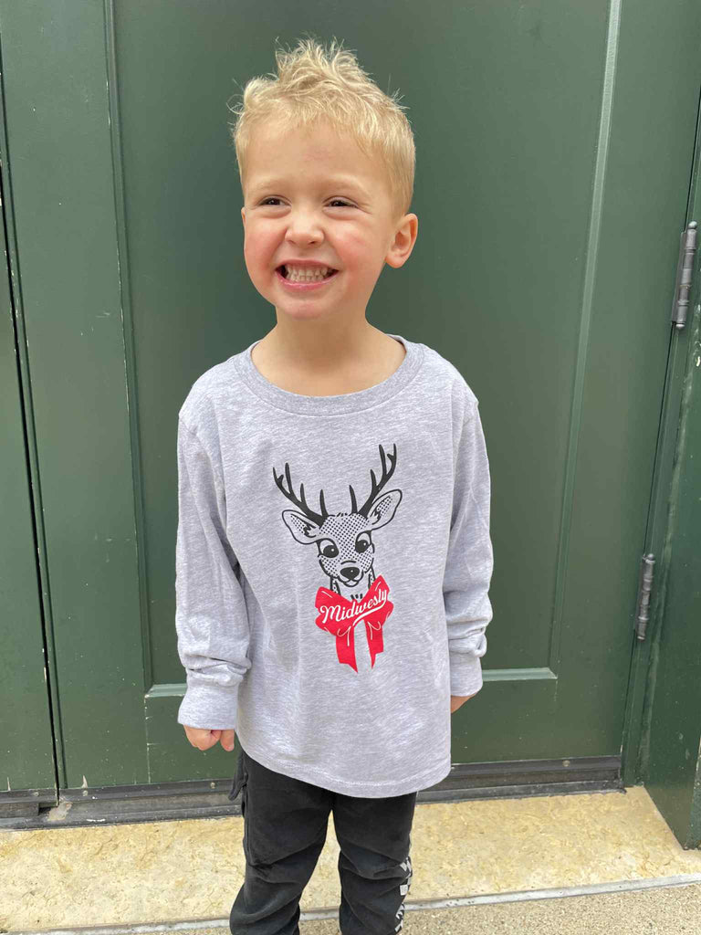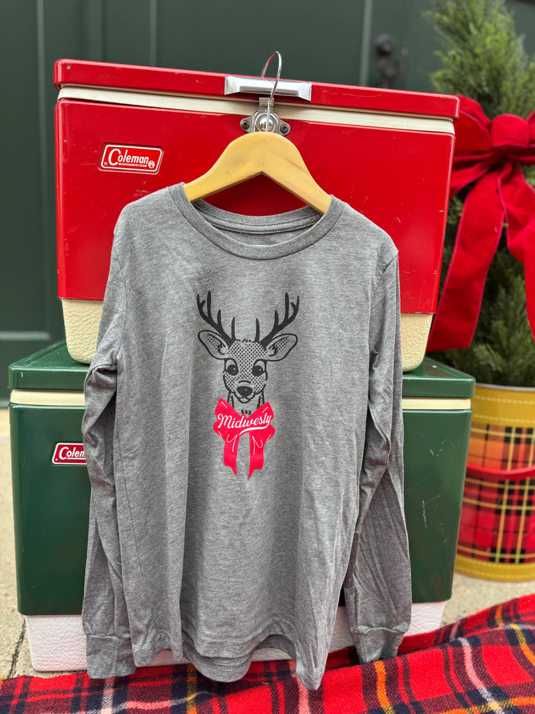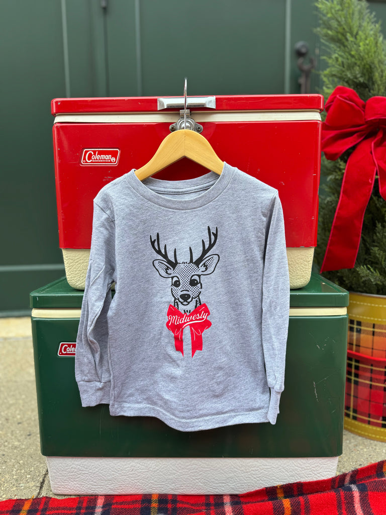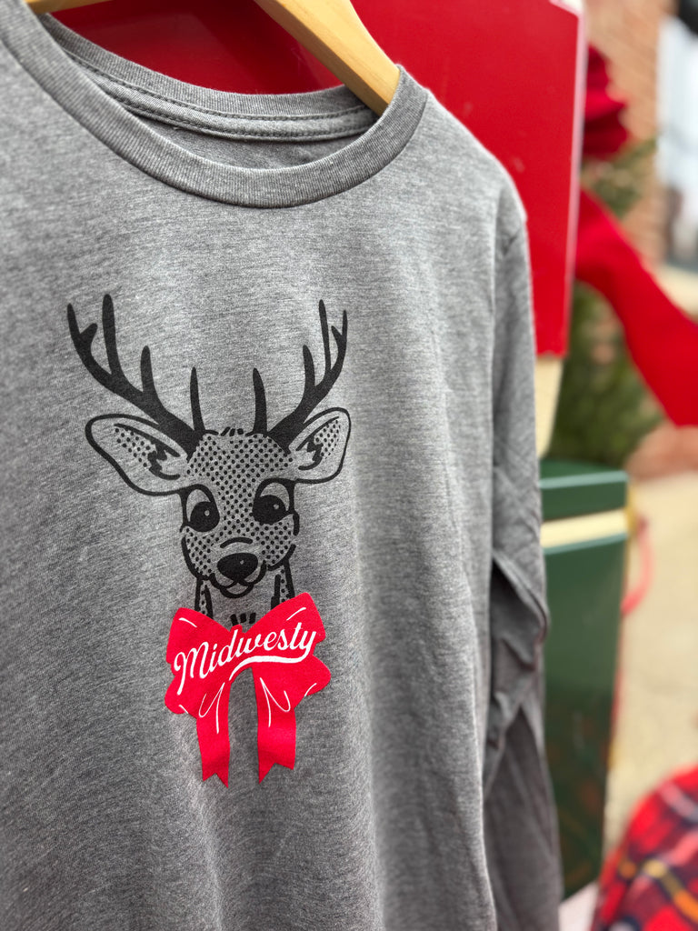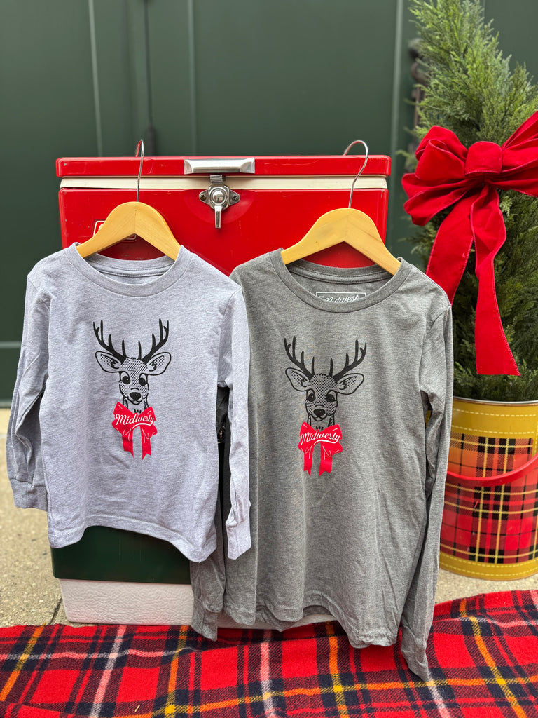 Midwesty® Buck Long Sleeve..a part of our midwest holiday tradition! Our mom always decorated the buck in the living room growing up. This tee is a nod to those family memories!